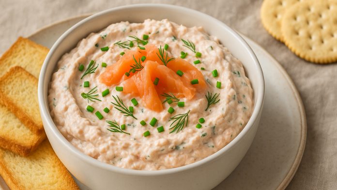 - Servir: Decorar con las tiras de salmón reservadas, un poco más de cebollín y eneldo fresco. Acompañar con pan tostado, galletas saladas o bastones de vegetales crudos.
